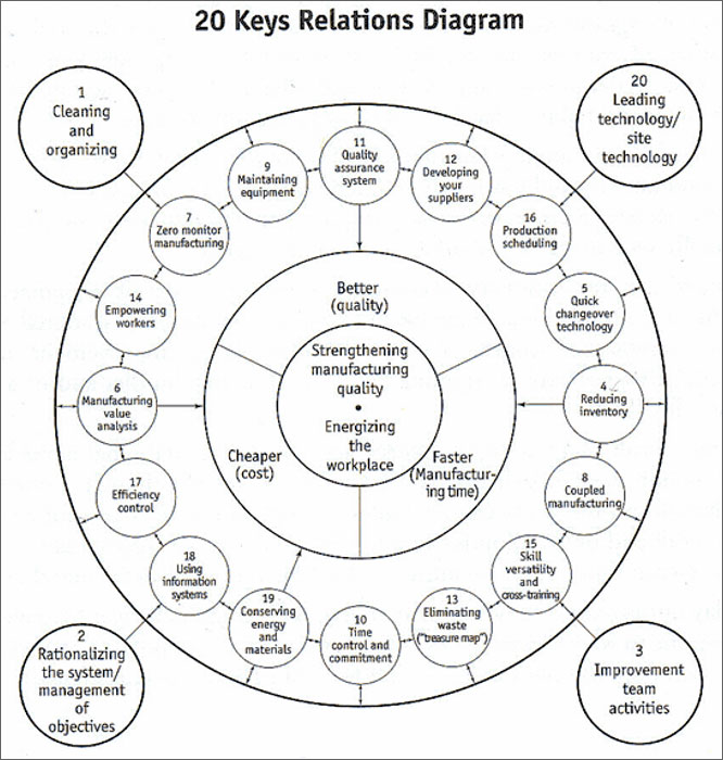 Iwao Kobayashi, in 1988 published a book explaining 20 keys to workplace improvement. They all must be considered in order to achieve continuous improvement. These 20 keys are arranged in a circle that shows the relations between the keys and their influence on the three main factors explained previously: quality, cost, and lead time.
